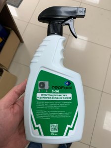 Средство для чистки PROFcool S-SG, разработанное специально для радиаторов и теплообменников внешних блоков климатических установок. Его основная задача быстро и эффективно удалять грязь, пыль,сажу, нагар, плесень, масло, копоть, жир и стоикие затвердевшие отложении на любой поверхности. Благодаря своей формуле, предотвращает размножение вредоносных микроорганизмов, обеспечивает максимальную очистку оборудования и улучшает теплообмен. Средство предотвращает окисление чистящей поверхности, что в свою очередь повышает эффективность работы кондиционера и увеличивает срок его службы.