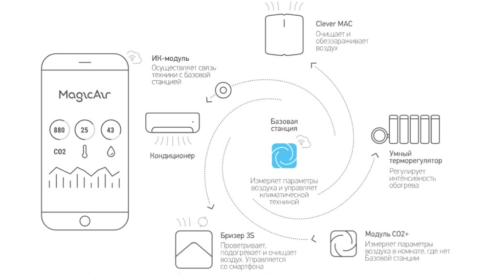 ОписаниеМодуль СО2+ дополняет и расширяет систему умного микроклимата TION MagicAir. Этот компактный гаджет собирает данные о состоянии воздуха в помещении, включая уровень СО2, влажность и температуру, и передает их на базовую станцию MagicAir. Модуль устанавливается в комнату с бризером, но без базовой станции, и предназначен для получения точных данных о состоянии воздуха и автоматического регулирования работы техники через MagicAir. Таким образом, базовая станция может автоматически регулировать работу всех бризеров в доме, даже не находящихся с ней в одной комнате, и поддерживать заданные пользователем параметры.